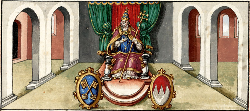 {{|1=Der hier dargestellte Papst Gregor V. war ein Enkel des fränkischen Herzogs Konrad des Roten. Daher erhält er auf diesem Bild neben dem Petersschlüssel auch den fränkischen Rechen zugeordnet. Darstellung in der Chronik der Bischöfe von Würzburg des Lorenz Fries (1489/91–1550). (Universitätsbibliothek Würzburg, M.ch.f.760, fol. 75r)}}