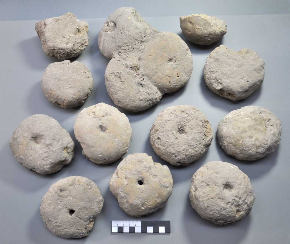 Webgewichte eines Webstuhls aus einer Abfallgrube des 8. Jahrhunderts in Altenerding. (Miltz) HLB