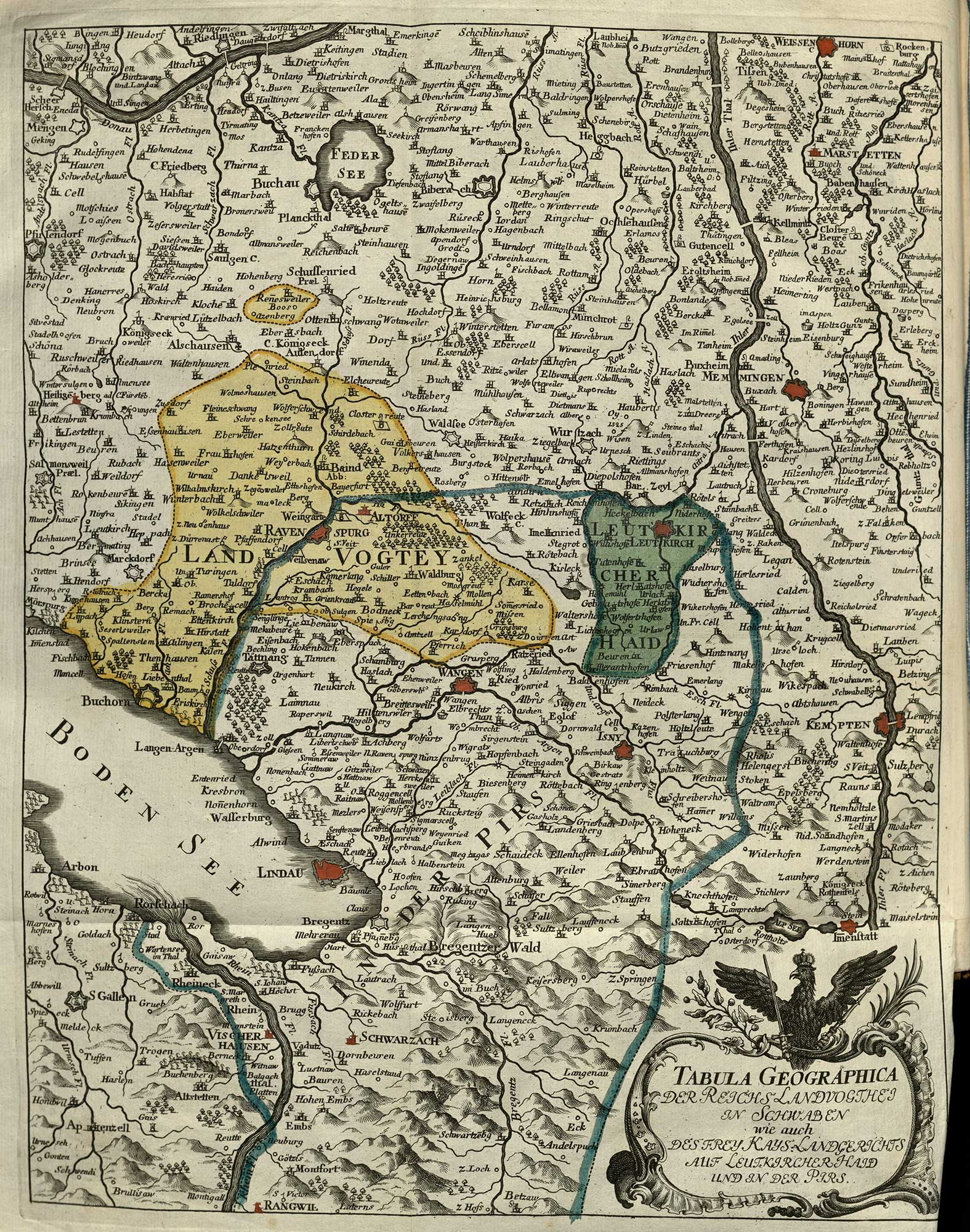 Karte der Reichslandvogtei Oberschwaben und des kaiserlichen Landgerichts auf der Leutkircher Haid von 1755. Abb aus: Johann Reinhard Wegelin, Historischer Bericht von der Kaiserl. und Reichs Land Vogtey in Schwaben wie auch dem frey Kayerl. Landgericht auf der Leutkircher Haid, und in der Pirß, o. O. 1755, vor 1. (Bayerische Staatsbibliothek, 2 Germ.sp. 158 x-1)