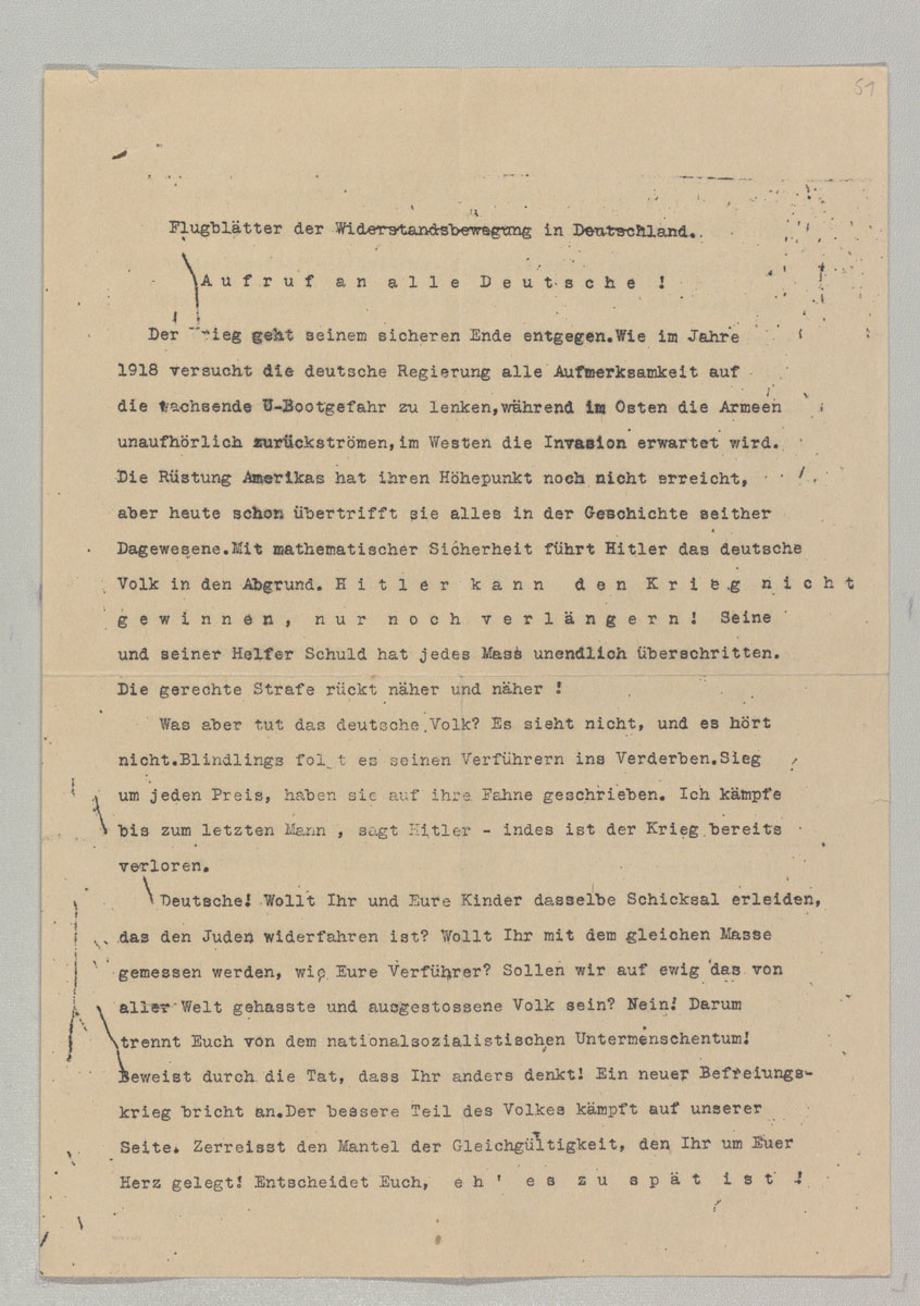 Erste Seite des Fünften Flugblatts der Weißen Rose, das zwischen dem 27. und dem 29. Januar 1943 verteilt wurde. (BArch, R 3018/18431) HLB
