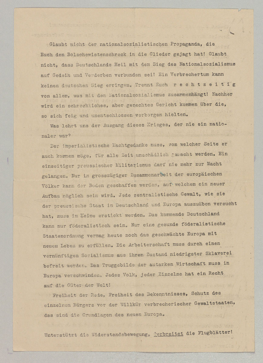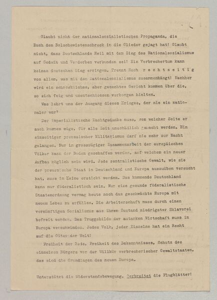 Zweite Seite des Fünften Flugblatts der Weißen Rose, das zwischen dem 27. und dem 29. Januar 1943 verteilt wurde. (BArch, R 3018/18431) HLB