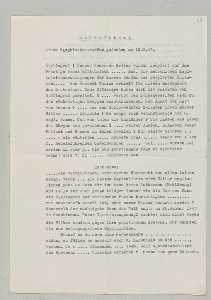Schrifttext eines Flugblattes der Weißen Rose, Vorderseite. (BArch, R 3017/34635)