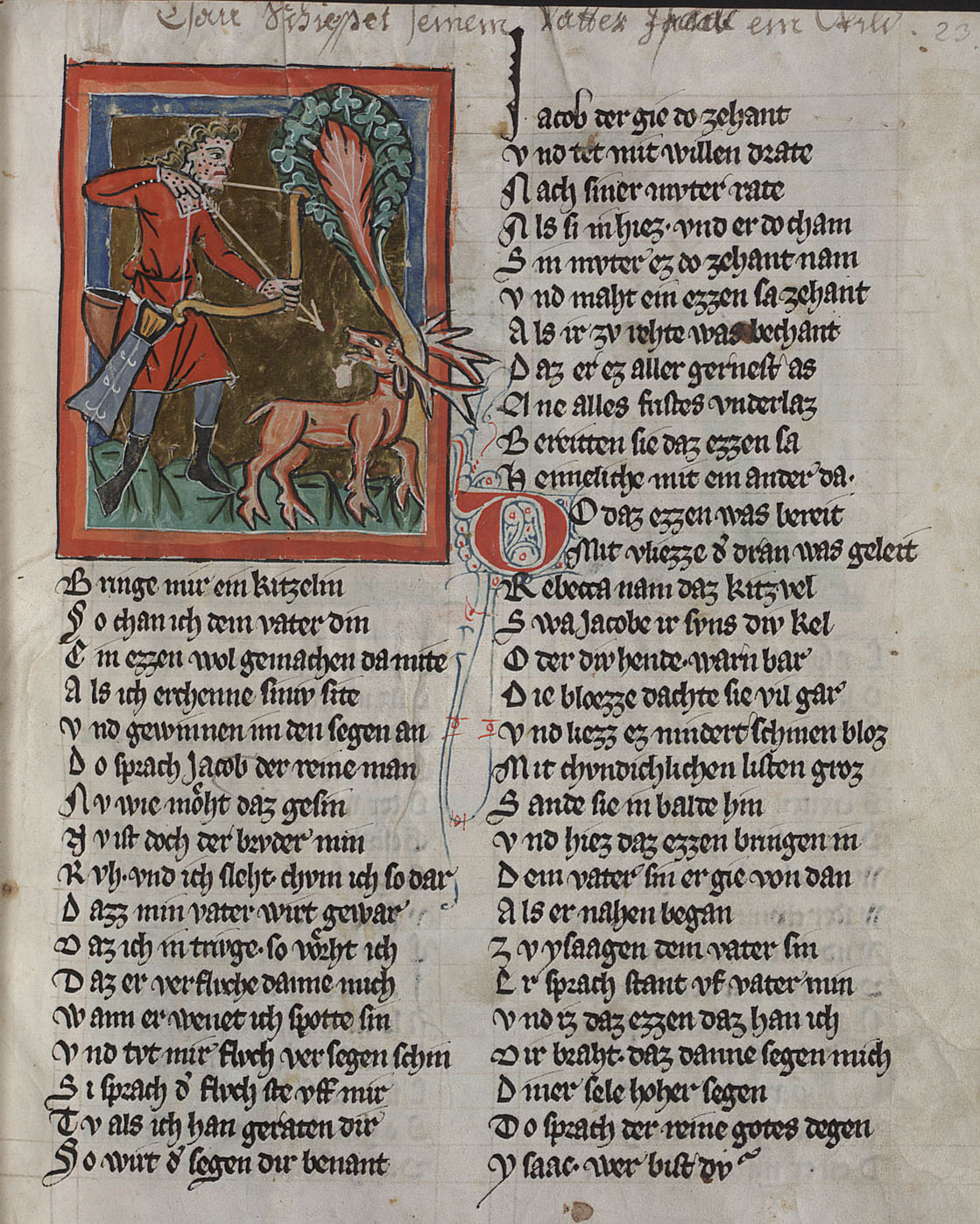 Alttestamentliche Jagdszene aus der Weltchronik des Rudolf von Ems, entstanden um 1300: Esau, den Sohn von Isaak und Rebecca, auf der Jagd. (aus: Weltchronik des Rudolf von Ems, Bistum Passau um 1300, Fol. 23r; Bayerische Staatsbibliothek Cgm 6406)