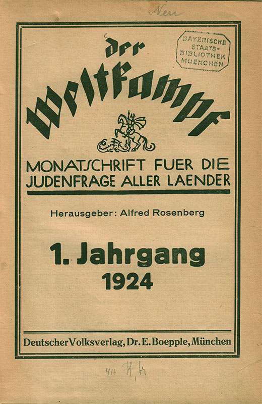 In der antisemitischen Zeitschrift "Der Weltkampf. Monatsschrift fuer die Judenfrage aller Laender" verbreitete Alfred Rosenberg seine Theorien. Titelblatt der ersten Ausgabe 1924. (Bayerische Staatsbibliothek)