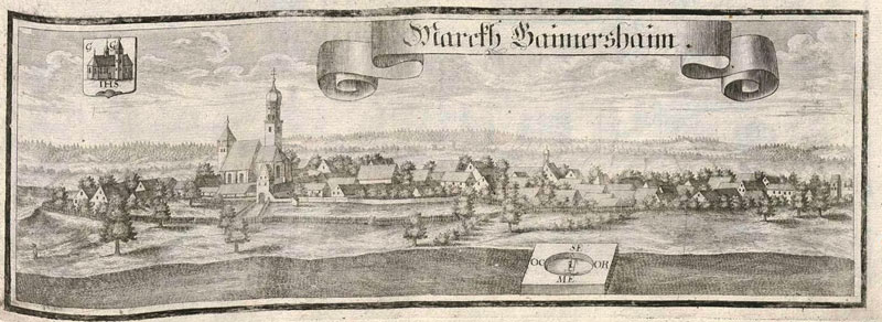 Markt Gaimersheim, Stich von Michael Wening 1701. Abbildung aus: Wening, Michael: Historico-Topographica Descriptio. Das Renntambt München, München, 1701, 212. (Bayerische Staatsbibliothek Hbks/F 18 c-1)