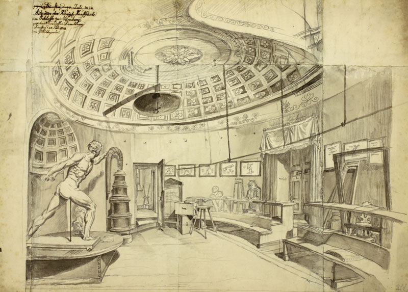 Studiensaal der Königlichen Kunstschule auf der Nürnberger Burg. Zeichnung von Georg Christoph Wilder (1797-1855), 1833. (Bildnachweis: Museen der Stadt Nürnberg, Kunstsammlungen) HLB