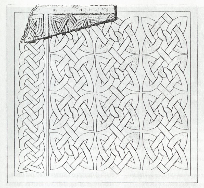 Rekonstruktion einer Chorschrankenplatte von der Insel Wörth. Abb. aus: Haas-Gebhard, Brigitte: Die Insel Wörth im Staffelsee: römische Befestigung, frühmittelalterliches Kloster, Pfarrkirche, Stuttgart 2000, 75. (Archäologische Staatssammlung/Brigitte Haas-Gebhard) HLB