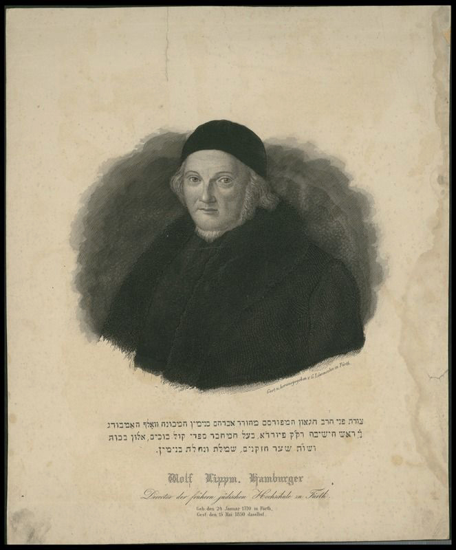 Wolf Hamburger (1770-1850) war Rabbiner und der letzte Leiter der Talmudschule in Fürth. Kupferstich von Gerson Löwensohn (1817-1871). (Public Domain via The National Library of Israel) HLB