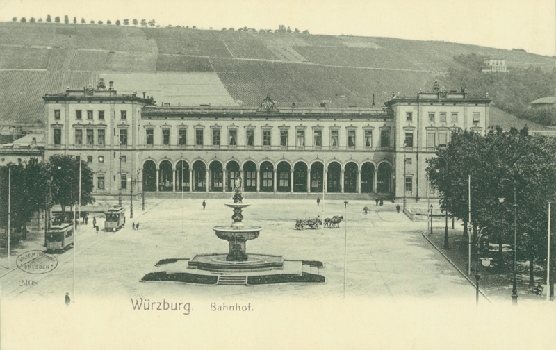 Würzburg Hauptbahnhof um 1920, Empfangsgebäude und Vorplatz. (DB Museum Nürnberg, 2022.002180) HLB
