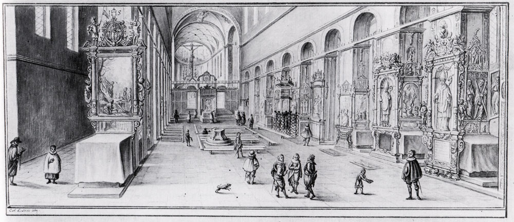 Innenansicht des Würzburger Doms nach der Umgestaltung zu Beginn des 17. Jahrhunderts. Tuschfederzeichnung von Carl Veit Laubreis (1769-1806), Ende 18. Jahrhundert. (Mainfränkisches Museum Würzburg, Inv.-Nr.: 21937)