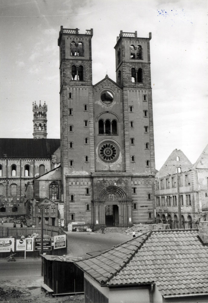Die Westfassade des im Zweiten Weltkrieg zerstörten Doms, Fotografie nach 1946. (Stadtarchiv Würzburg)