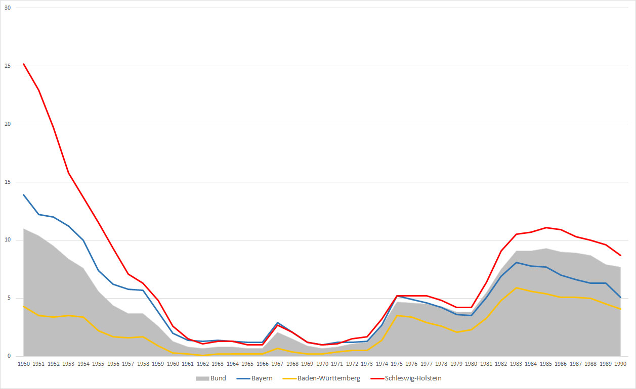 Arbeitslosenquote in Westdeutschland, Bayern und anderen Ländern 1950-1990. HLB