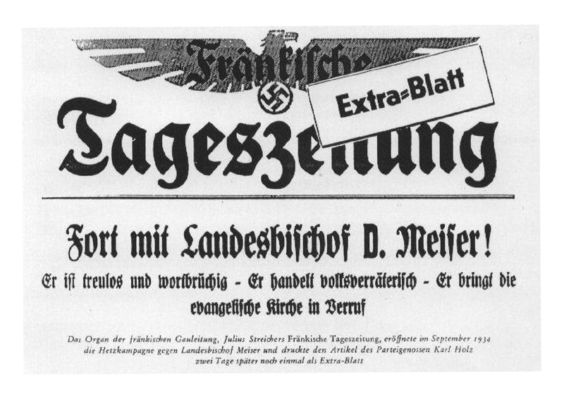 Zeitungsartikel: „Fort mit Landesbischof D. Meiser“, in: Fränkische Tageszeitung, 15.09.1934. (Prof. Dr. Gerhard Meiser) HLB