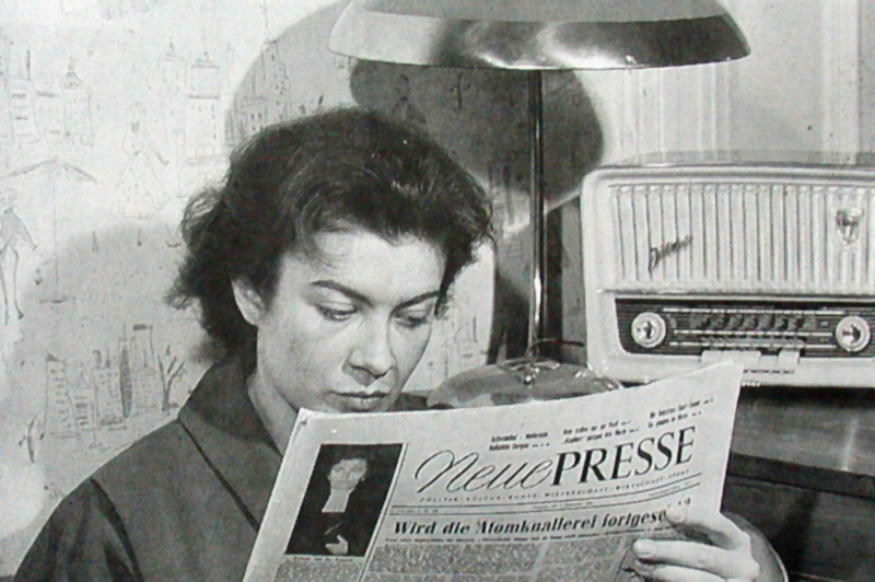 Eine Zeitungsleserin der "Neuen Presse". Werbefoto der Neuen Presse aus den 1950er Jahren. (Neue Presse Coburg) HLB