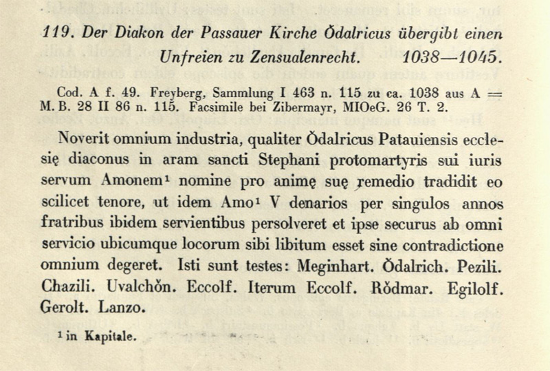 Der Diakon der Passauer Kirche Odalricus übergibt einen Unfreien zu Zensualenrecht. Ausschnitt aus: Heuwieser, Max: Die Traditionen des Hochstifts Passau, München 1930, Nr. 119. HLB
