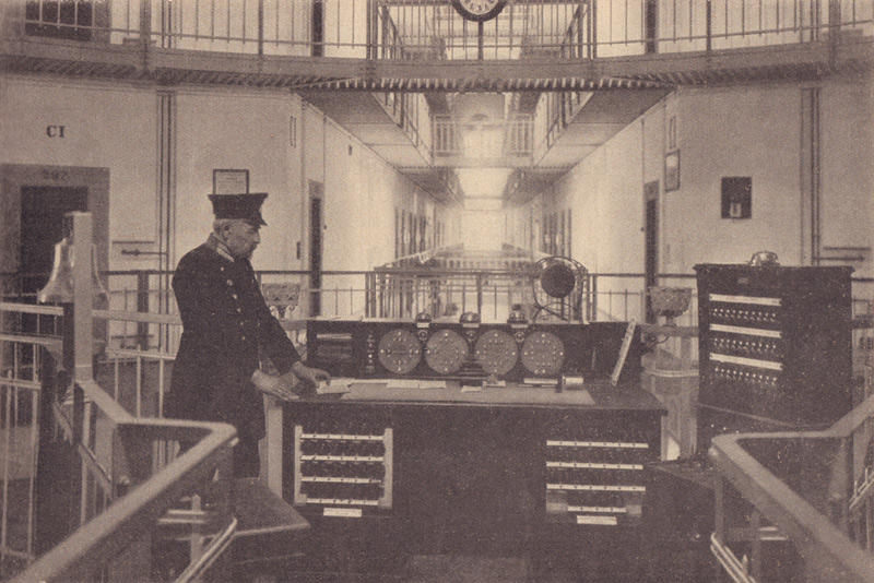 Der Oberwachtmeister auf der Kanzel der Zentrale des Zellenbaues der Strafanstalt Landsberg am Lech. Abb. aus: Das Bayerland, Jahrgang 37 vom März 1926, 165. (Bayerische Staatsbibliothek, 4 Bavar. 198 t-37) HLB