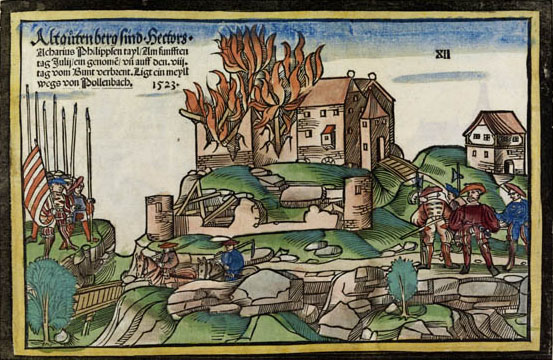 {{|1=Zerstörung der Burg Altguttenberg durch Truppen des Schwäbischen Bundes. Holzschnitt von Hans Wandereisen, 1523. (Staatsbibliothek Bamberg, RB.H.bell.f.1, fol. 19r/Foto: Gerald Raab)}}