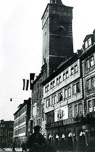 Am 9. März 1933 wurde am Würzburger Rathaus die Hakenkreuzfahne neben der schwarz-weiß-roten Fahne des Deutschen Kaiserreiches gehisst.(Stadtarchiv Würzburg, Photosammlung "Nationalsozialismus")