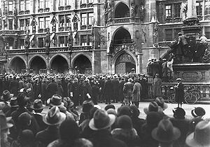 Eine Menschenmenge versammelte sich am 9. März 1933 auf dem Münchner Marienplatz, um der Hissung der Hakenkreuzfahne am Rathaus beizuwohnen. (Stadtarchiv München DE-1992-FS-NS-00031)