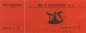 Das Ensemble "Die Elf Scharfrichter" war das erste Kabarett Münchens. Es existierte von 1901 bis 1904 in einem Rückgebäude in der Münchner Türkenstraße 28. Zu Mitgliedern und Mitwirkenden des Kabaretts zählten u a. Otto Falckenberg (1873–1947), Hanns von Gumppenberg (1866–1928), Eduard Graf von Keyserling (1855–1918), Frank Wedekind (1864-1918), Thomas Theodor Heine (1867–1948) und Olaf Gulbransson (1873–1958). Trotz des großen Erfolgs der Bühne existierte sie lediglich für drei Jahre. Mangelndes wirtschaftliches Geschick, unerfüllbare künstlerische Vorstellungen und immer schärfere Einschränkungen durch die Zensurbehörde führten bereits 1904 zum Niedergang des ersten Münchner Kabaretts.