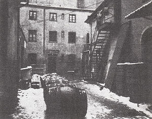 Der Innenhof der Türkenstraße 28 auf einer Aufnahme aus dem Jahre 1903. Rechts das Theater der "Scharfrichter" mit der Eisentreppe, die in das Sekretariat im ersten Stock führte. (Foto aus Bühne und Brettl 4, 1903)