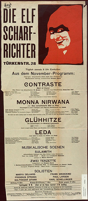 Etwa 400 Nummern gelangten im Theater der "Scharfrichter" zur Aufführung. Die wichtigsten Gattungen ihrer Bühne waren dramatische Szenen (über 50 Titel), gesprochene Solovorträge (über 40) und Nummern mit Musik, darunter vor allem deutsche und französische Sololieder (ca. 270), musikalische Ensembleszenen und dramatische Nummern mit Musik (ca. 30) sowie Instrumentalmusik (ca. 10).