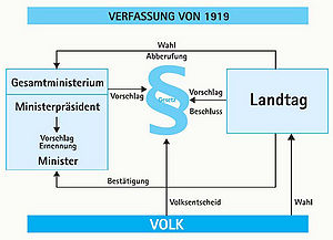 On the other hand, the installation of a second chamber of parliament was avoided, definitely with the restrictions under the law of the Reich as stipulated in the so-called homogeneity clause of Article 17(1) of the WRV in mind. Only the option of setting up professional representations with greatly reduced competences "to carry out the economic and social tasks of all creative circles of the people" – in the sense of a last relic of the idea of worker’s councils – was included in the constitution (Article 24 BV).