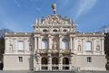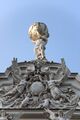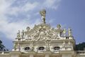 A special feature is the use of band rustication on all the pilasters and columns; this was most prominent in the late Renaissance and therefore does not align with the required style. This eclecticism is likely due to the fact that the application of rustication, essentially a motif derived from fortifications, was intended to enhance the representation of state and sovereign power across the entire façade, not just at the base level. The façade programme reflects this focus. The façades of Linderhof Palace are thus freely designed using historical motifs. One exception is the central risalit of the main façade, whose design, featuring herms, a volute pediment, the coat of arms, and the crowning Atlas figure, references the Wall Pavilion of the Dresden Zwinger. The decorative gables on the sides there are echoed in Linderhof on the risalits of the side façades.