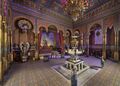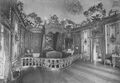 The commissioned court architect, Georg von Dollmann (1830–1895), was first tasked with designing a small, symmetrical, three-part suite of rooms featuring an enfilade, comprising an oval central room and two adjoining horseshoe-shaped smaller rooms or “cabinets” (Pink Cabinet, Dining Room, and Blue Cabinet), in accordance with the client's growing wishes. Shortly after its completion in November 1870, this sequence of rooms was replicated on the opposite side of the developing palace (Yellow Cabinet, Audience Room, and Purple Cabinet). A bedroom subsequently connected the two northern wings. Access was provided via an external staircase and through the Königshäuschen. It was only after the old cottage was dismantled and relocated in 1874, and a larger three-part suite of rooms was added to the south part of the palace by 1877 (comprising the Western Tapestry Room, the Eastern Tapestry Room, and the centrally positioned Hall of Mirrors), that a coherent interior layout became possible. The previous "cour,” a narrow inner courtyard, was replaced by a double-flight staircase serving as the central access point to the now-encompassing suite of rooms on the upper floor. Functional spaces were added on either side of the two entrance rooms, the vestibule and the staircase anteroom. These included day rooms for servants and adjutants, a modern kitchen, storage rooms, heating systems, and the mechanism for the “Tischlein-deck-dich” (Wishing Table) table elevator serving the dining room above. In the northern section, a dressing room and the king's bathroom, adorned with paintings of Venus bathing with nymphs, were installed. The bathwater was supplied directly to the palace via a drinking water pipe and heated in a dedicated oven. These rooms were also accessible from the rear of the palace through a door in the north façade and a concealed door within the wall panelling behind the first staircase landing. The bathroom is connected to the bedroom above via a spiral staircase.