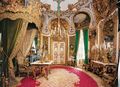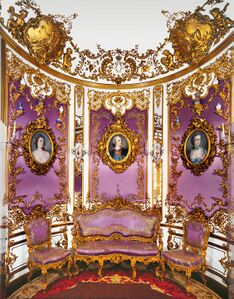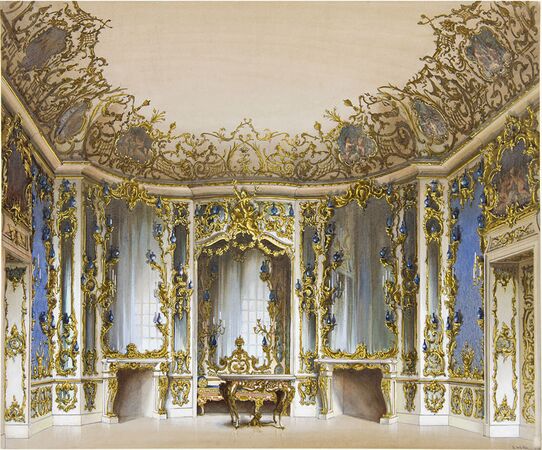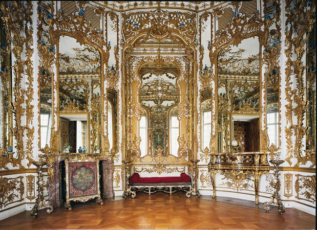 Behind the grand baroque façade of the palace, a Neo-Rococo style emerges, reflecting the era of the French kings Louis XIV (1638–1715, r. 1643–1715) and Louis XV (1710–1774, r. 1715–1774). The decorative scheme of the rooms is also indebted to the history and figures of the Ancien Régime. However, the stylistic and ornamental elements draw on southern German Rococo from the buildings of the Wittelsbach dynasty.