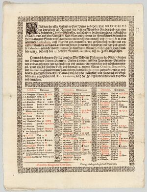 Dreimonatskalender für Oktober bis Dezember 1582, gedruckt im Auftrag Herzog Wilhelms V. von Bayern. Er enthielt zur Information der Bevölkerung die geplante und dann nicht realisierte Auslassung der 10 Tage mit Sprung vom 4. auf den 15. Oktober 1582, zudem die Feiertage, den Heiligenkalender sowie nützliche astronomische und meteorologische Mitteilungen. (Bayerisches Hauptstaatsarchiv, Kurbayern Mandatensammlung 1582)