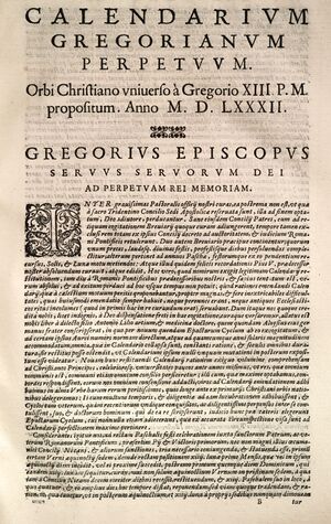 Päpstliche Bulle Inter gravissimas vom 24. Februar 1582, abgedruckt in: Christoph Clavius, Romani calendarii a Gregorio XIII.P.M. restituti explicatio: S.D.N. Clementis VIII. P.M. iussu edita, Rom 1603, 13–15. (Bayerische Staatsbibliothek BV008808991 Gemeinfrei via ND-NC 1.0)