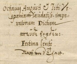 Der verantwortliche Stadtschreiber der Stadt Landshut, der mit der Rücknahme des herzoglichen Einführungsmandats im Oktober 1582 befasst war und deswegen zusätzlich Arbeit hatte, kommentierte den Rücknahme-Vorgang in humanistischer Gelehrsamkeit. Er notierte auf der Rückseite des Entwurfs eines diesbezüglichen Schreibens: "Octavii Augusti et Titi Vespaniani laudatissimorum imperatorum Dictum: πεῦδε βραδέως, Festina lente, Rath vor der Thatt", wobei er das den römischen Kaisern Augustus und Titus zugeschriebene Diktum nicht wörtlich mit "Eile langsam!" übersetzte, sondern vielmehr die Notwendigkeit des Gut-Beraten-Werdens betonte. (Stadtarchiv Landshut B1 Nr. 1122)