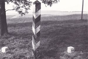 Um die Eigenstaatlichkeit der DDR zu unterstreichen, setzten Angehörige der DDR-Grenztruppen von August 1967 bis Juli 1969 auch entlang der Grenze zu Bayern zwischen dem Schwarzen Moor in der Rhön und dem Dreiländereck bei Prex Grenzsteine und 888 Grenzsäulen. (Bundespolizeidirektion München)