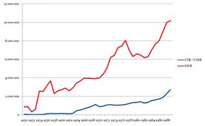 Ein- und Durchfahrten aus der Tschechoslowakei nach Bayern (KFZ insgesamt) 1950 bis 1985. (Quelle: Statistisches Jahrbuch für Bayern. Graphik: Markus Meinke)