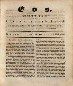 Die oben genannten Zeitschriften fügen sich in die sich entwickelnde Landschaft der katholischen Zeitschriften im deutschsprachigen Raum ein. Dabei sind wissenschaftliche Zeitschriften von solchen zu unterscheiden, die eher milieusichernd arbeiteten, d. h., die spezifische Gruppen (Akademiker, Frauen, Familien) mit Texten versorgen wollten, die deren Bindung ins (ultramontan-) katholische Milieu sichern konnten. 1828 erwarb die Gruppe um Franz von Baader auf dessen Initiative hin das bis dahin politisch und religiös unauffällige Blatt "Eos - eine Zeitschrift aus Baiern, zur Erheiterung u. Belehrung". Es war 1818 vom Präsidenten des Appellationsgerichtes und Staatsrat Karl Christian von Mann (1773-1837) gegründet worden. Seit 1826 fungierte der Schriftsteller Franz von Elsholtz (1791-1872) als Herausgeber des halbakademisches Unterhaltungsblatt mit feuilletonistischer Ausrichtung. Ab dem 2. Januar 1828 änderte sich der Untertitel in "Münchener Blätter für Poesie, Literatur und Kunst, herausgegeben von einem Verein von Gelehrten und Künstlern". Zur Finanzierung der Zeitschrift stellten Cornelius und Schlotthauer Verkaufserlöse ihrer Werke zur Verfügung. Zwar war die Auflage der wöchentlich mehrmals erscheinenden Zeitschrift mit rund 150 Stück stets gering, doch war die Reichweite über die Weitergabe und Lesevereine deutlich größer. Jedoch schränkte der relativ hohe Preis von 6 Gulden für das Jahresabonnement die Zahl der Leserschaft ein.