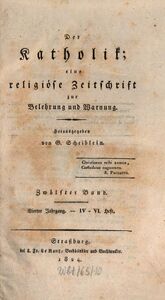Titelblatt der Zeitschrift "Der Katholik", die ab 1821 zuerst in Mainz und dann in Straßburg erschien. (Bayerische Staatsbibliothek, Th.u. 200 t-4,11)