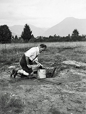Ein Mann schöpft aus einer Quelle bei Bad Wiessee Petroleum. Aufnahme aus dem Jahre 1928. (Bild: Gemeindearchiv Bad Wiessee)