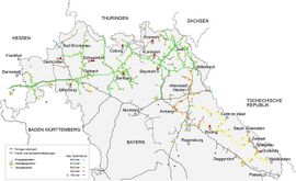 Die Karte zeigt das Erdgasfernleitungsnetz der Ferngas Netzgesellschaft mbH. Es erstreckt sich über eine Länge von 2.140 km über ganz Nordbayern. Das Unternehmen wurde am 30. Juni 2017 durch eine Fusion zwischen der Ferngas Nordbayern GmbH und der Ferngas Thüringen-Sachsen GmbH gegründet. (Karte: Ferngas)