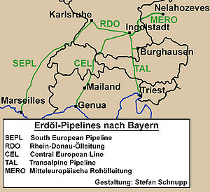Die bedeutendste Pipeline für Bayern ist die TAL (Transalpine Pipeline), die mit ihren 40 Zoll (101 cm) Durchmesser von Triest (Italien) aus mit einem Abzweig (18 Zoll, 45 cm) in Kärnten (Österreich) die österreichische Raffinerie in Schwechat (bei Wien, Österreich) versorgt. In Steinhöring zweigt eine weitere Leitung (12 Zoll, 30 cm) ab, die seit 1967 die Raffinerie in Burghausen beliefert.
