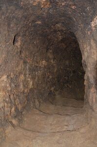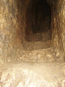 In bestimmten Gegenden wurde ein Hilfsschacht für den Abtransport des gelösten Materials abgeteuft. Solche Hilfsschächte haben einen runden oder rechteckigen Querschnitt und mitunter Trittlöcher in den Wänden. Nach dem Bau wurde der Schacht zum Gang hin mit einer Trockenmauer verschlossen und verfüllt (Abb. 14).