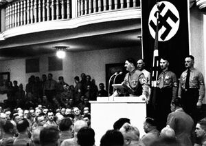 Hitler während einer Rede im Bürgerbräukeller in München zur Gedenkfeier am 8./9. November 1937. (Bayerische Staatsbibliothek, Bildarchiv hoff-31552)
