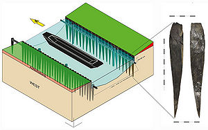 In tieferen Bereichen sollten massive Holzeinbauten ein Unterspülen und Nachrutschen der Böschungen verhindern. 2013 gelang es, einen Bauabschnitt mit komplett fertiggestellten Uferbefestigungen zu dokumentieren. An beiden Rändern der Fahrrinne waren bis zu 1,9 m lange Eichenpfähle in den Untergrund eingerammt, die eine spundwandartige Konstruktion bilden. Die Pfähle sind sorgfältig bebeilt und stark standardisiert. Trotz des hohen Aufwandes hielt die Konstruktion dem Böschungsdruck nur teilweise Stand. Die Pfähle fanden sich teilweise stark verkippt. Zwischen und über die Hölzer waren unmittelbar nach oder sogar noch während des Baus Fließsande in die Fahrrinne gerutscht.