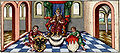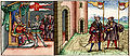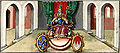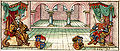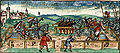 Darstellung eines 938 angeblich in Magdeburg ausgetragenen Turniers, an dem auch der mit dem Rechen versehene salische Herzog Konrad der Rote (gest. 955) teilgenommen haben soll. (Universitätsbibliothek Würzburg, M.ch.f.760, fol. 56r)