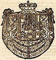 Großes Kurbayerisches Wappen von 1804. In der dazugehörigen Verlautbarung vom 7. November 1804 heißt es u. a.: "Wegen dem Herzogthum Franken: Rechts ober dem rechten Quartier des Mittelschilds sind drey silberne Spitzen im rothen Felde […]. Wegen dem Fürstenthum Würzburg: Am Ecke rechts sieht man ein schrägrechts gelegtes von Roth und Silber geviertheiltes und zweymal gekerbtes Fähnlein an einer goldenen Lanze." Abb. aus: Regierungsblatt für die Churpfalzbaierischen Fürstenthümer in Franken aus dem Jahre 1804, 232. (Bayerische Staatsbibliothek, 4 Bavar. 3059 d-2)