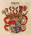 Wappen Fürstbischofs Julius Echter von Mespelbrunn (1545-1617, reg. 1573-1617). Abb. aus: Wappen der zu Regensburg zur Reichsversammlung 1594 anwesenden Fürsten, [Regensburg], 1594, fol. 22r. (Bayerische Staatsbibliothek, Cod.icon. 326)
