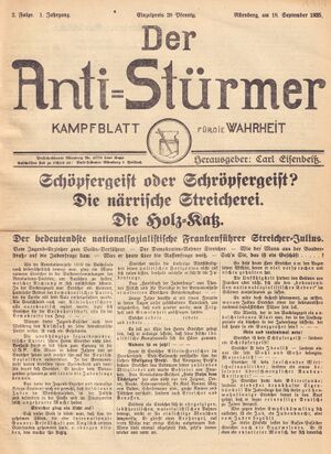 Mithilfe seiner Zeitschrift "Der Stürmer" mit radikalantisemitischen Inhalten und Enthüllungsgeschichten über angebliche Skandale, mit zahlreichen öffentlichen Redeauftritten und medienwirksam inszenierten Gerichtsprozessen erreichte Streicher vor 1933 eine deutschlandweite Aufmerksamkeit. In Mittelfranken, speziell in Nürnberg, entstand geradezu der Eindruck einer Omnipräsenz. Dies ist ein Grund, der es bislang erschwert hat, eine wissenschaftliche Gesamtbetrachtung Streichers vorzunehmen. Bisherige Arbeiten konzentrierten sich entweder auf seinen Radikalantisemitismus, psychologische Erklärungen dafür, seine publizistische Tätigkeit mit Schwerpunkt auf den "Stürmer" oder die politischen Umstände seiner Absetzung 1939/40. Die schnell entstandene Popularität Streichers nicht nur unter seinen langjährigen Anhängern, wofür der synonym und spätestens nach 1933 unreflektiert verwendete Begriff "Frankenführer" der bekannteste Ausdruck ist, lässt sich dadurch nicht erklären. Zu abstoßend und skandalbehaftet wäre eigentlich der Typus Streicher für eine Massengefolgschaft gewesen.