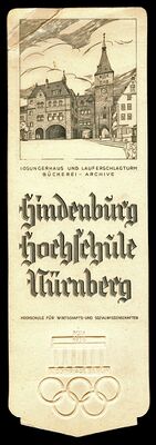 Lesezeichen der Hochschule anlässlich der Berliner Olympiade 1936 mit einer Abbildung des Gebäudes am Laufer Schlagturm. (Universitätsarchiv Erlangen-Nürnberg D2/2 Nr. 36)