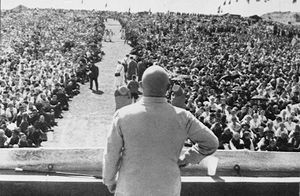Begonnen hatte die Transformation des Ausflugsberges zu einem NS-Kultplatz im Jahr 1928. Gauleiter Streicher sprach zum Ende der Hesselbergmesse auf einem Lastwagen vor einigen hundert Anhängern. 1930 trat zum ersten und einzigen Mal Adolf Hitler (1889-1945) auf dem Hesselberg auf.