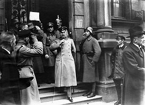 Prozess gegen die Teilnehmer des Hitler-Putsches in der Kaserne der Infanterieschule; 1. April 1924. Erich Ludendorff verlässt das Gebäude nach der Urteilsverkündung. (Bayerische Staatsbibliothek, Bildarchiv hoff-6624)